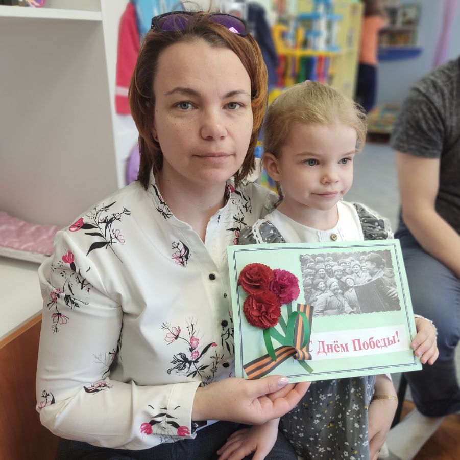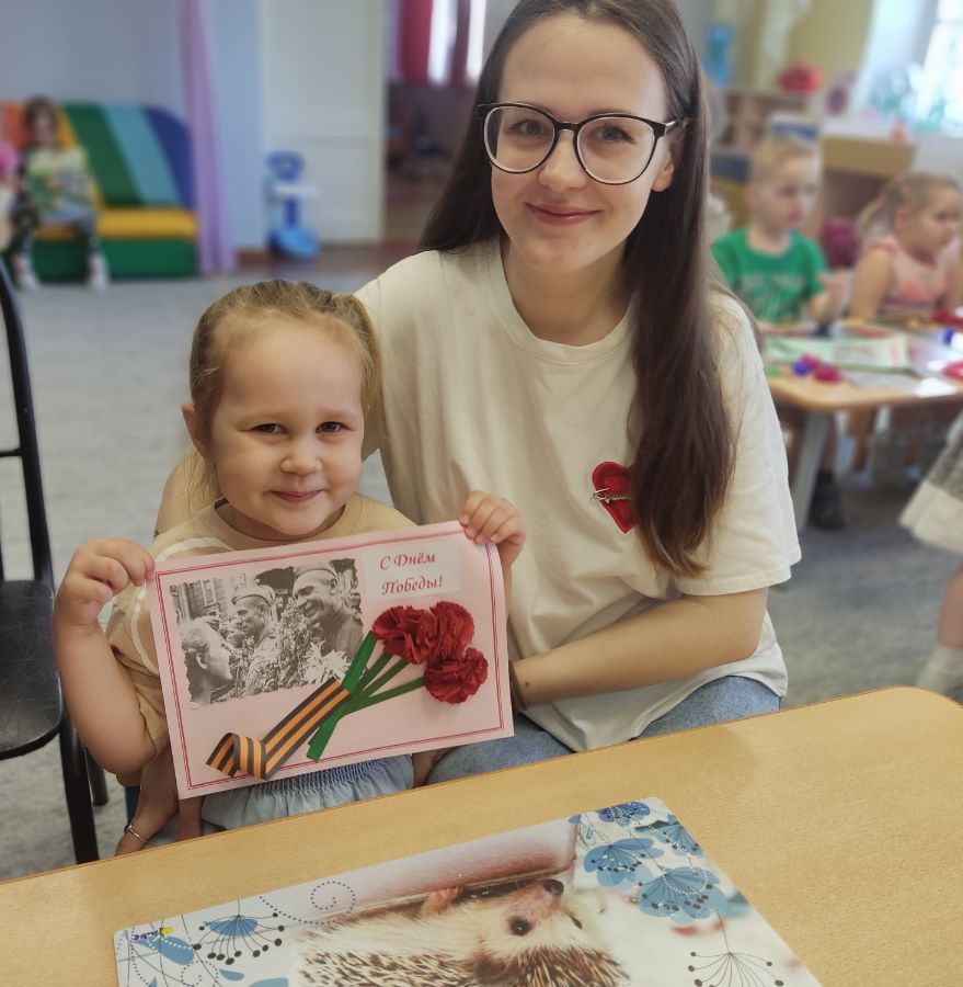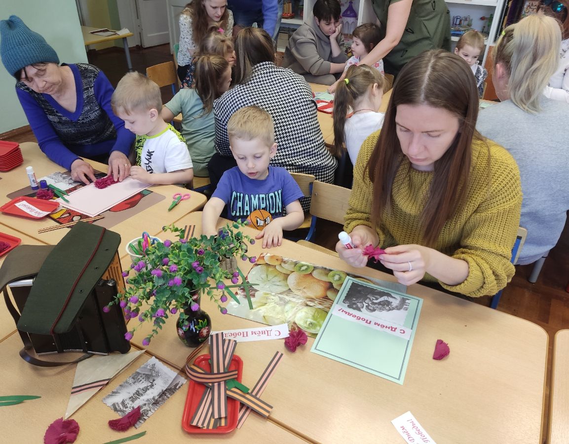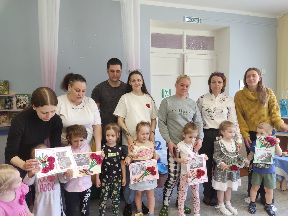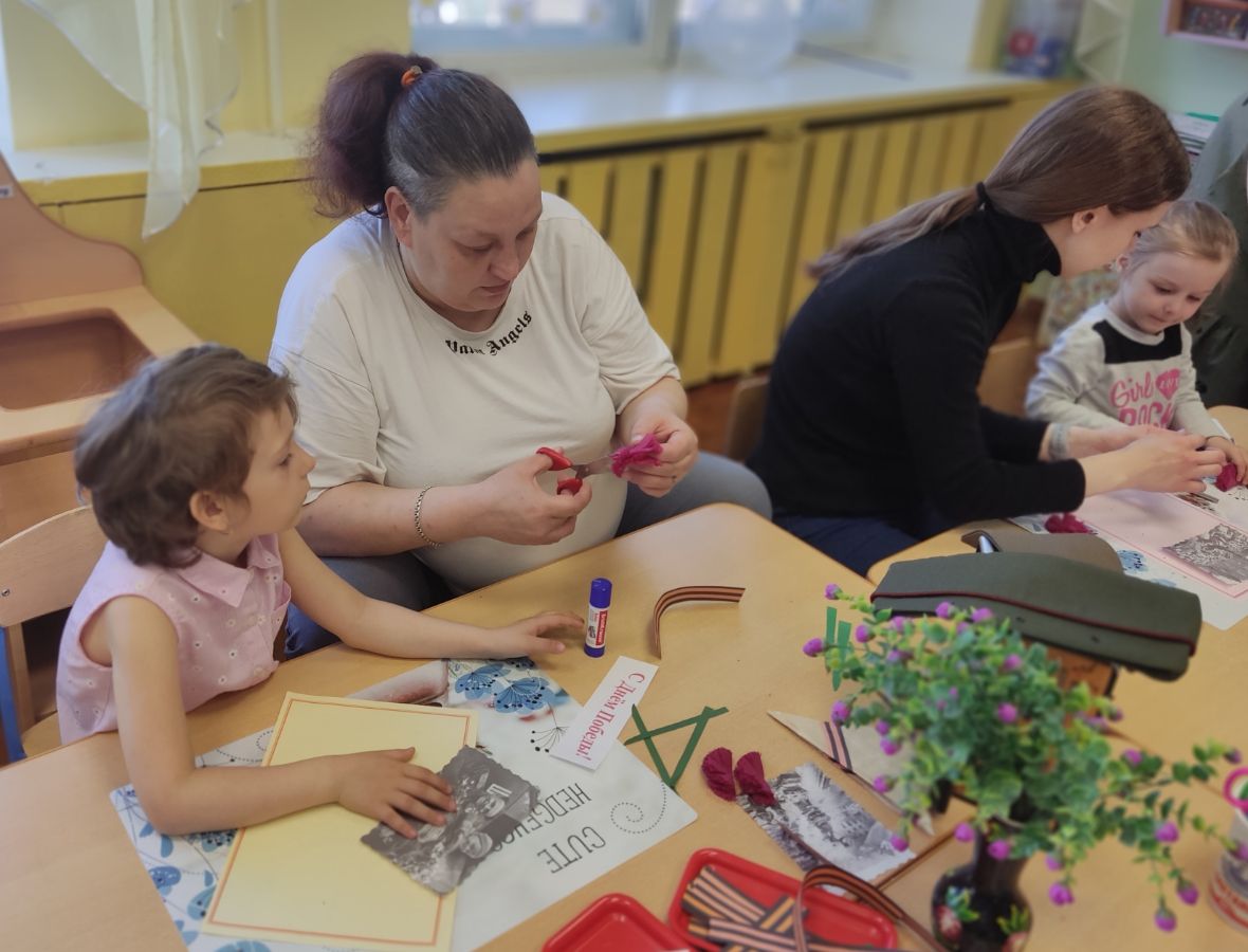 В предпраздничный день в нашей группе прошёл мастер -класс с родителями и детьми «Открытка к 9 Мая для жителей нашего города». Родители с большим удовольствием вырезали гвоздики, делали поздравительные надписи, а ребята им в этом помогали.