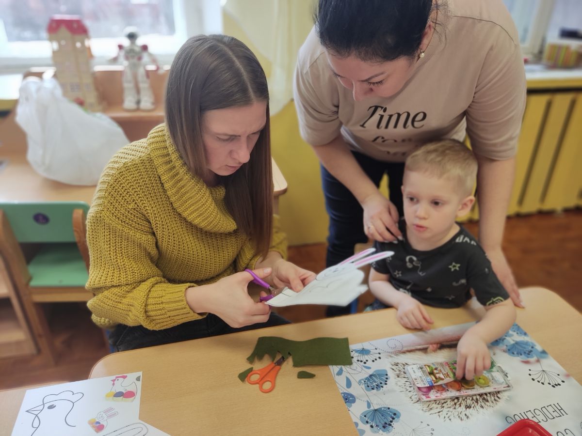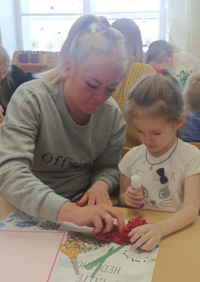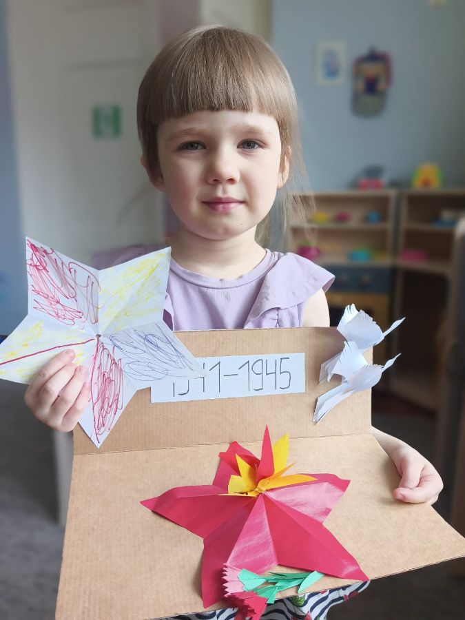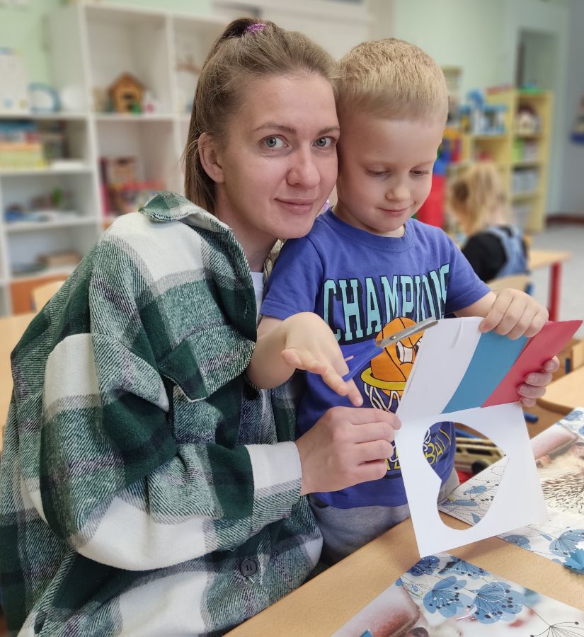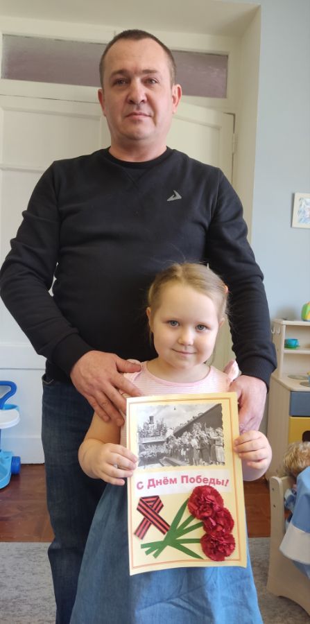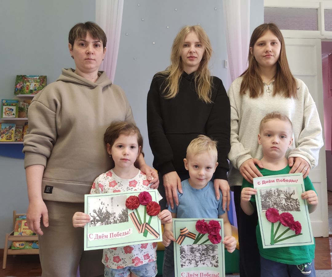 В предпраздничный день в нашей группе прошёл мастер -класс с родителями и детьми «Открытка к 9 Мая для жителей нашего города». Родители с большим удовольствием вырезали гвоздики, делали поздравительные надписи, а ребята им в этом помогали.