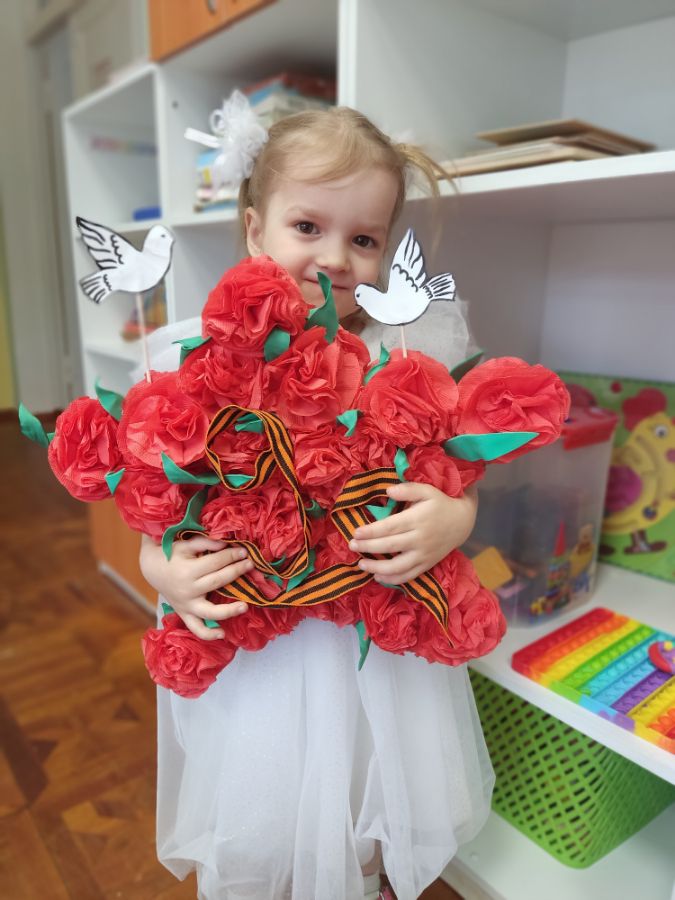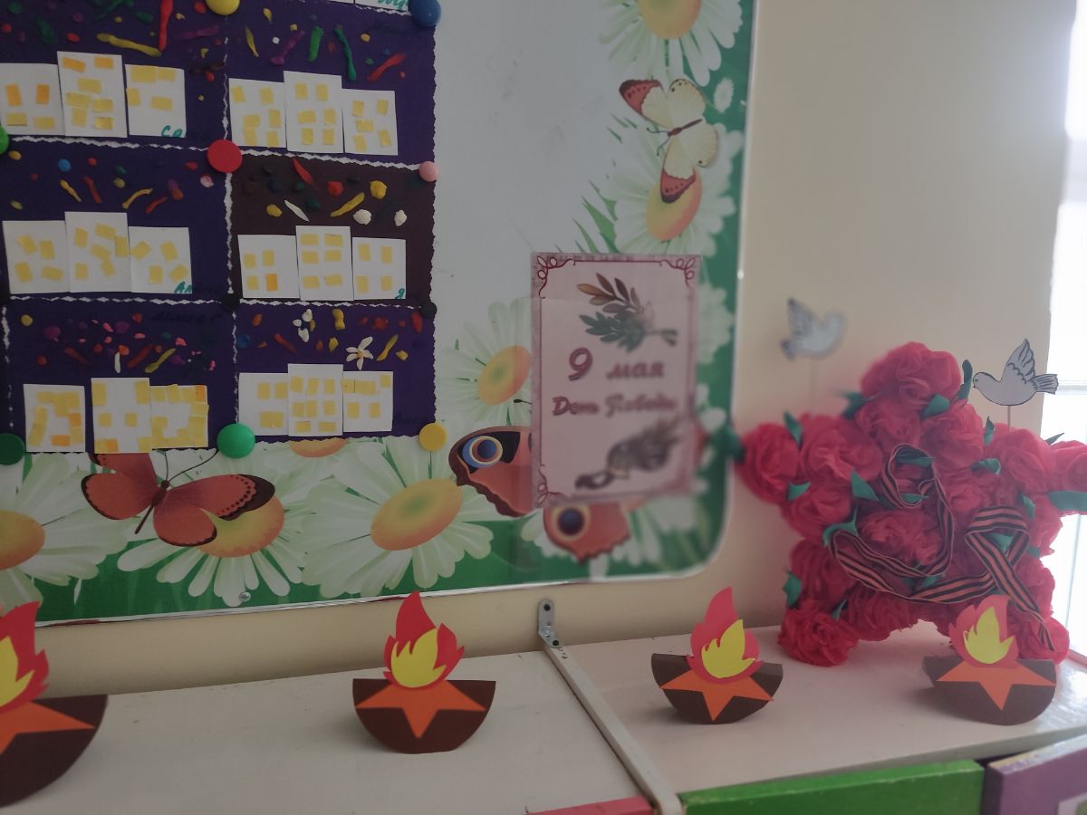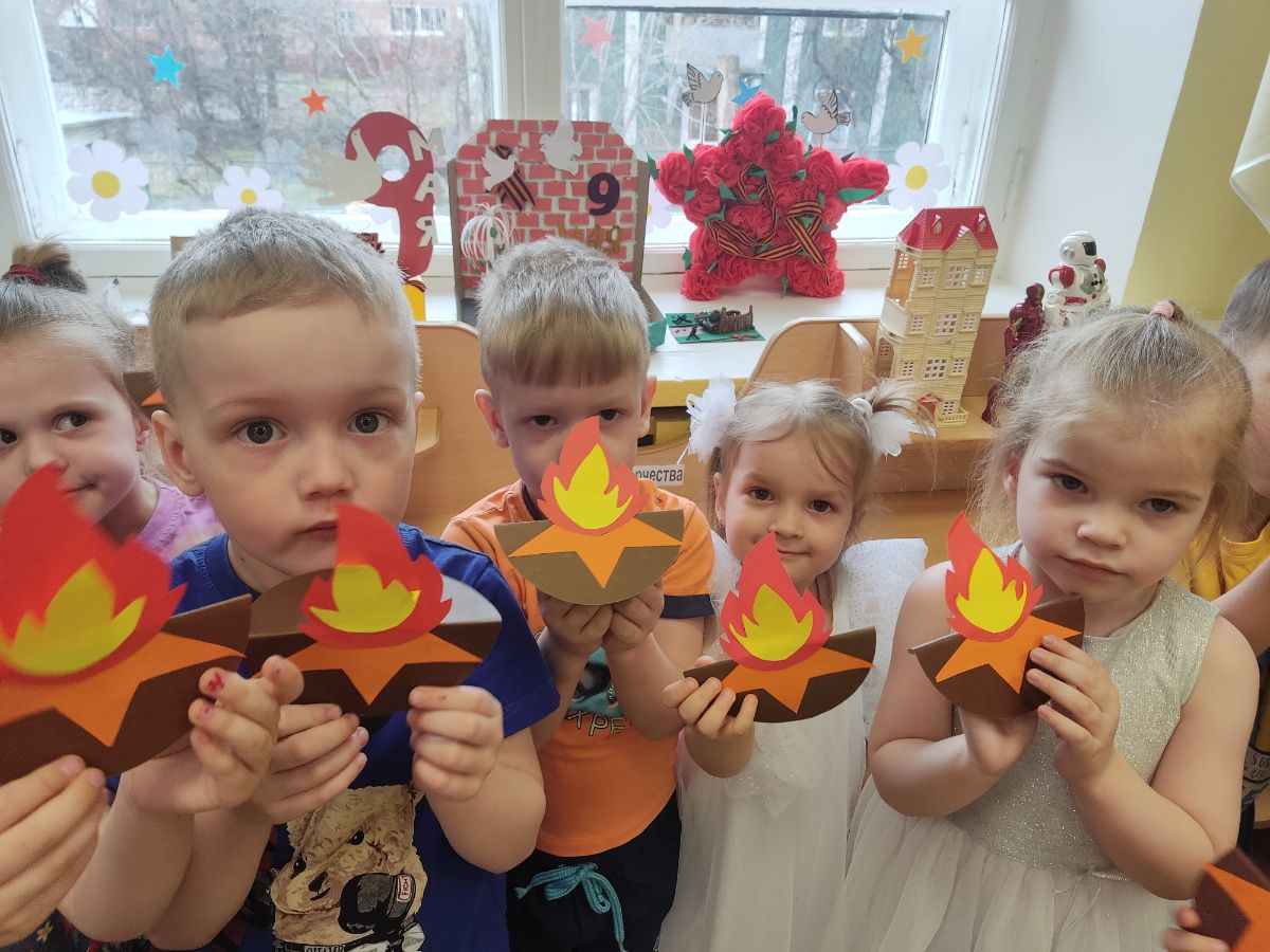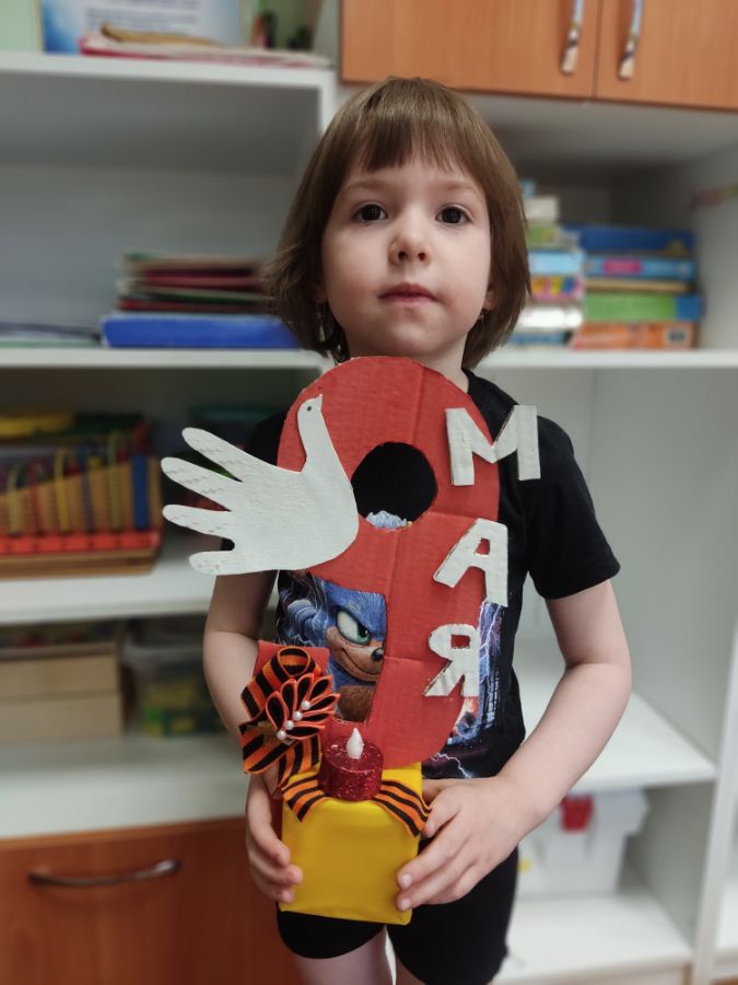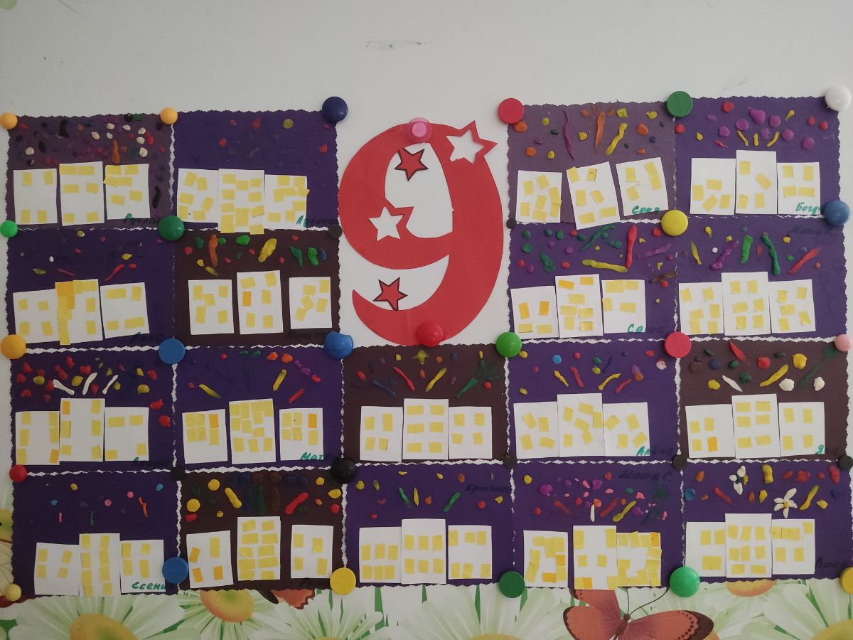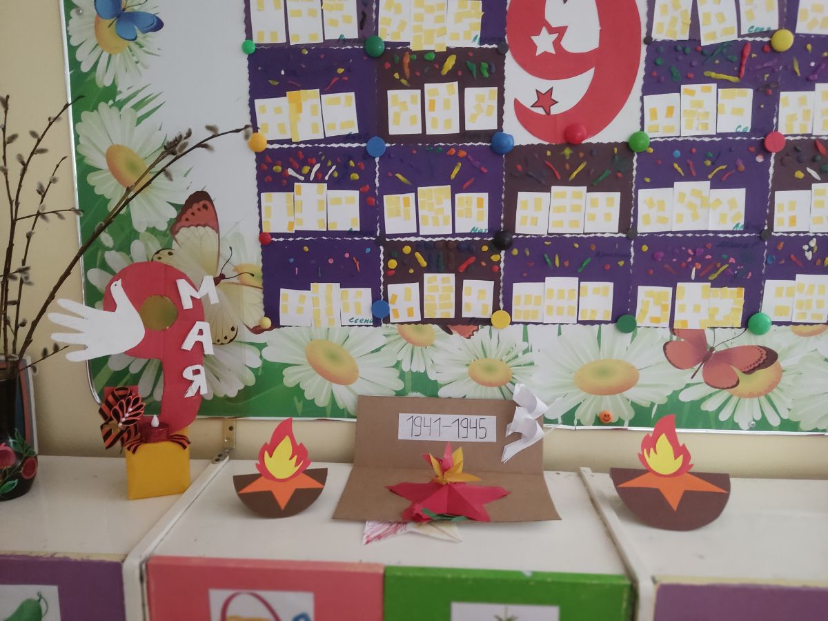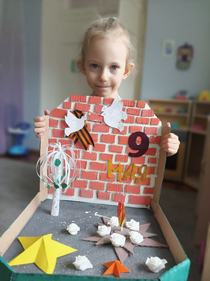 С целью создания праздничного настроения и торжественной обстановки наши ребята изготавливали работы для выставки и украшения приёмной: «Вечный огонь» и «Праздничный салют 9 Мая в городе».