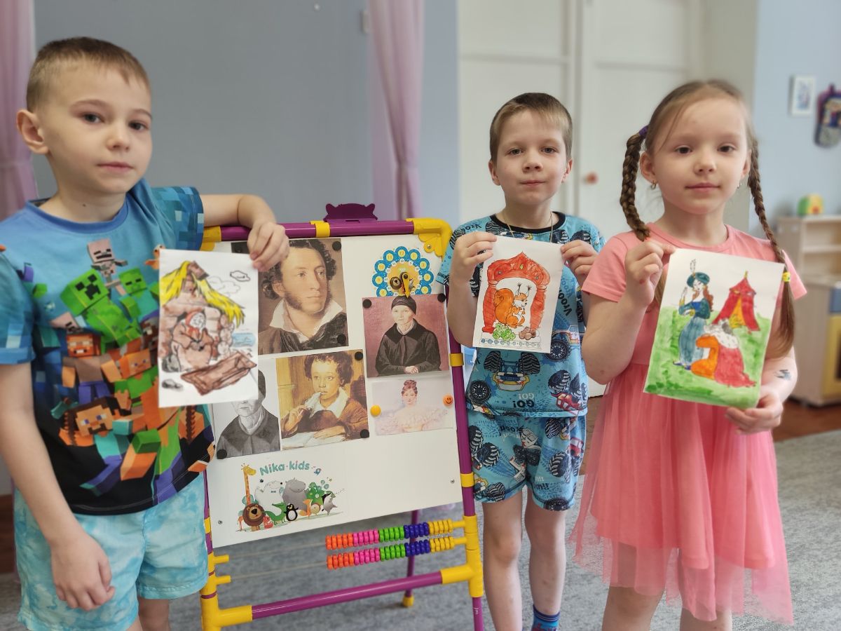 В нашем детском саду в группе № 4 прошли мероприятия, посвящённые расширению знаний детей о творчестве А.С. Пушкина. Предварительная работа включала в себя изучение биографии А.С. Пушкина - беседы о детских годах поэта, его семье, местах, где он жил, учился; знакомство со сказками, чтение стихов поэта.