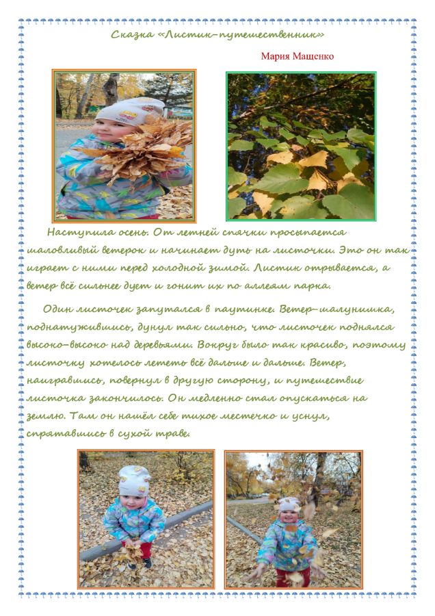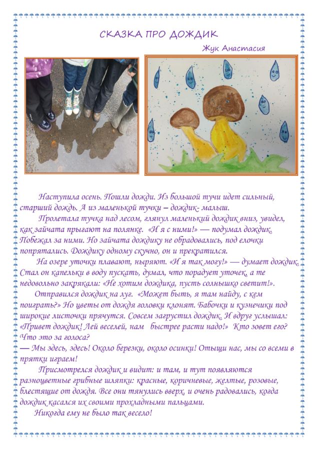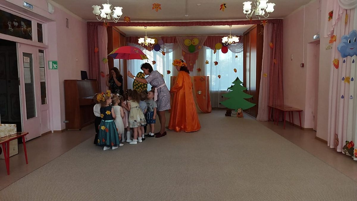 Маленьких дошколят в музыкальном зале встретила Осень со своими лесными друзьями – зайкой, белочкой и медвежонком. Ребята спели песенки про «золотые» листики, зайку, прочитали небольшие стихотворения про осень; помогли белочке собрать шишки на зиму; сыграли на музыкальных инструментах вместе с мишкой. Во время праздника даже пошёл дождик, но он никого не сумел намочить, потому что дети успели спрятаться под зонтиком.