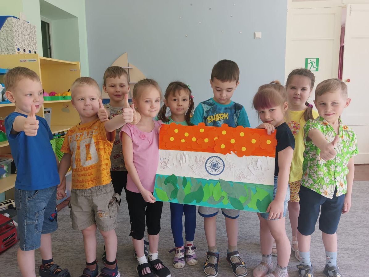 Наши воспитанники узнали о национальном флаге, гербе, столице Индии, что шахматы, йога – родом из Индии, национальной одежде жителей этой страны и теперь имеют представление, что у женщин -это сари, а на голове мужчин можно увидеть тюрбан. Просмотрели мультфильмы по мотивам индийских сказок и книг Р. Киплинга: «Золотая антилопа», «Рикки-Тикки-Таки», «Маугли». Делали аппликацию индийских слонов, которые занимают в культуре Индии очень большое место. Познакомились с искусством мехенди – росписью по телу хной и попробовали даже сами нанести уникальные узоры на отпечатки своих ладошек фломастерами.